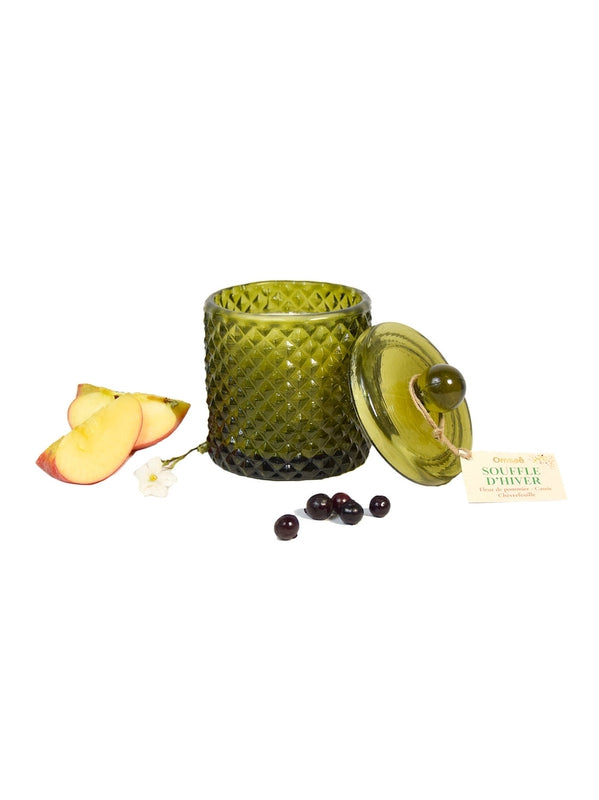 Bougie parfumée Souffle d’Hiver 100 % cire végétale (cire de soja et cire de palme RSPO). Mèche en coton. Durée de combustion d'environ 35 h. Poids net : 160 g. Dimensions bougie : hauteur : env. 11 cm. Diamètre : env. 8 cm. Contient : linalool, hexyl cinnamal, geraniol, methylenedioxyphenyl methylpropanal, hexyl salicylate.