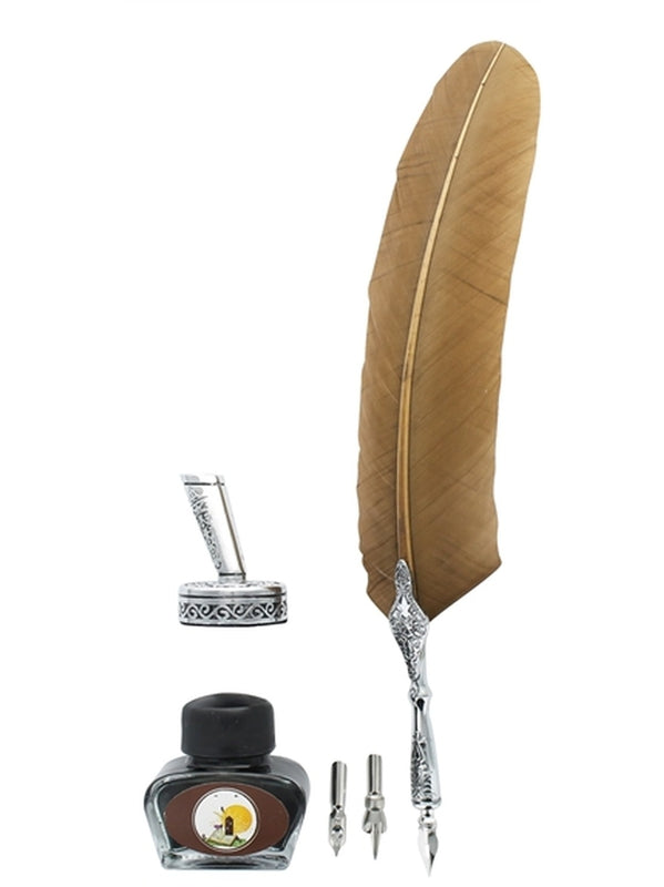Stylo à plume naturelle. 3 pointes d'écriture en laiton (2 pointes fines, 1 pointe large). Dimensions plume et pointe : environ 28 cm x 5,5 cm x 0,8 cm. Flacon en verre d’encre noire à base d'eau et colorants, 30 ml. Porte-stylo en métal.