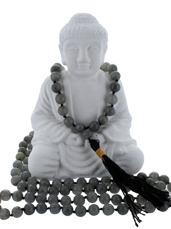 Mala signifie en sanskrit «collier de fleurs» ou «guirlande de perles». Ces colliers sont composés de 108 perles en pierre naturelle. La plus grosse perle (ou «bille de tête») représente la connaissance de la vacuité. Le petit cône qui la surmonte est le symbole de la vacuité elle-même. Diamètre boule : 6 à 8 mm. La Labradorite protège du mal-être d'autrui et des énergies négatives. Longueur totale : 76 cm.